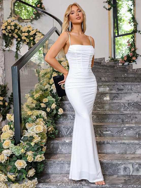 Women’s Sleeveless Bodycon Corset Maxi Dress Spaghetti Strap Ruched Elegant Evening Wedding Guest Long Formal Dresses